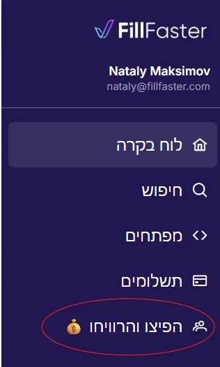 Section titled “כניסה ללוח השותפים:”- לאחר ההרשמה, היכנס לחשבון FillFaster שלך.